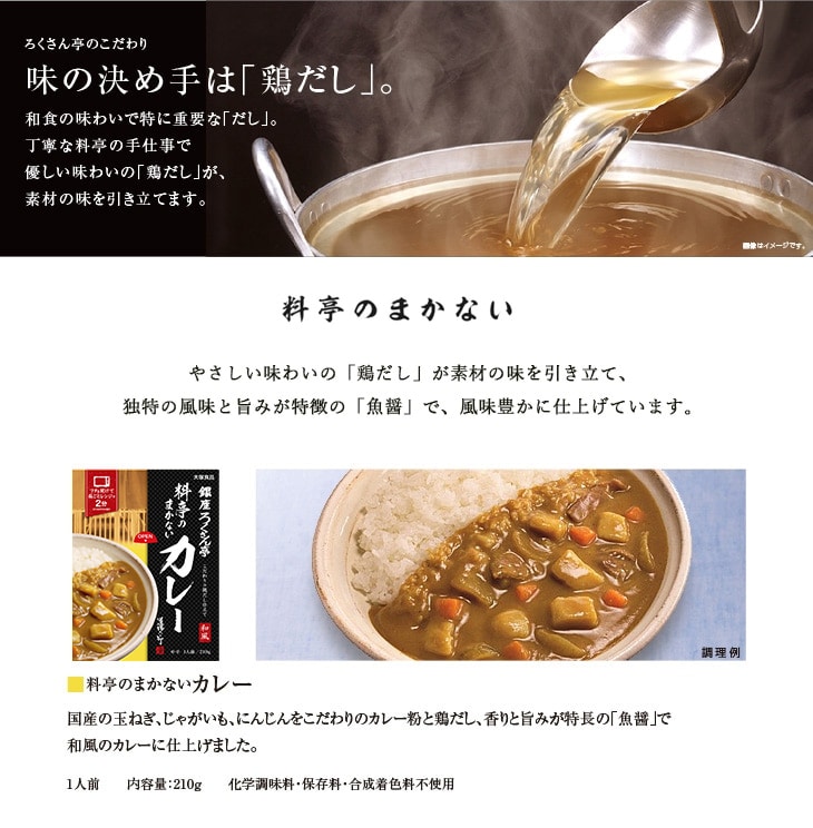 国産の玉ねぎ、じゃがいも、にんじんをこだわりのカレー粉と鶏だし、隠し味の魚醤で仕上げた和風カレーです。化学調味料・保存料・合成着色料不使用。