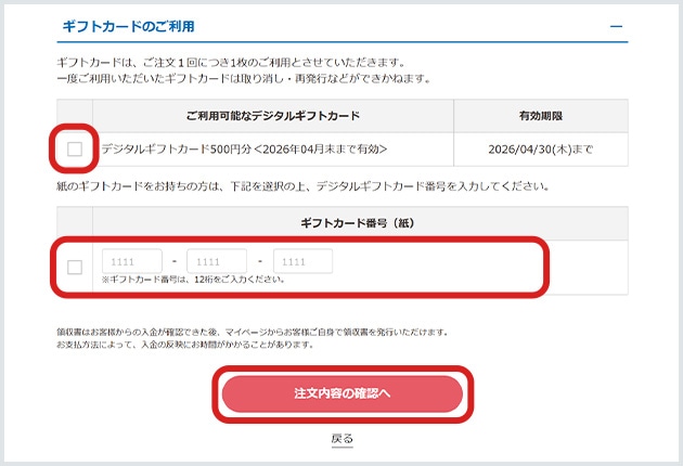 チェックを入れて12桁のギフトカード番号を入力し、「注文内容の確認へ」ボタンをクリックしてください。※ギフトカードはご注文1回につき1枚のご利用とさせていただきます。