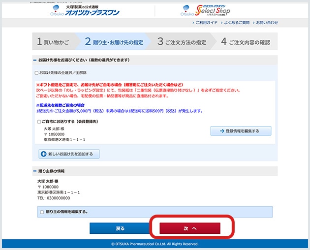 「お届け先様」、「贈り主様」の情報を入力または編集していただき、ページ下部の「次へ」をクリックしてください。