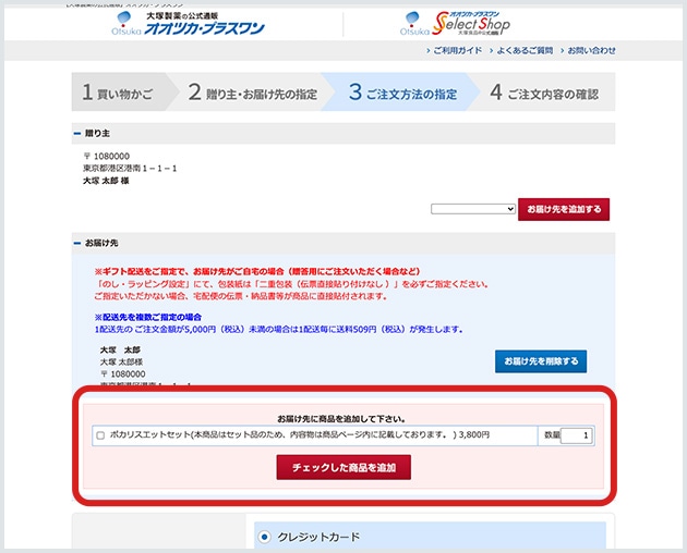 お届け先ごとに配送をご希望の商品にチェックをし、「チェックした商品を追加」をクリックしてください。