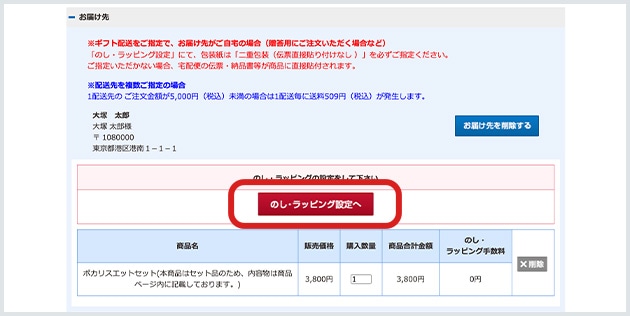 のし・ラッピングをご希望のお客様は、「のし・ラッピング設定へ」をクリックしてご希望の包装をお選びください。