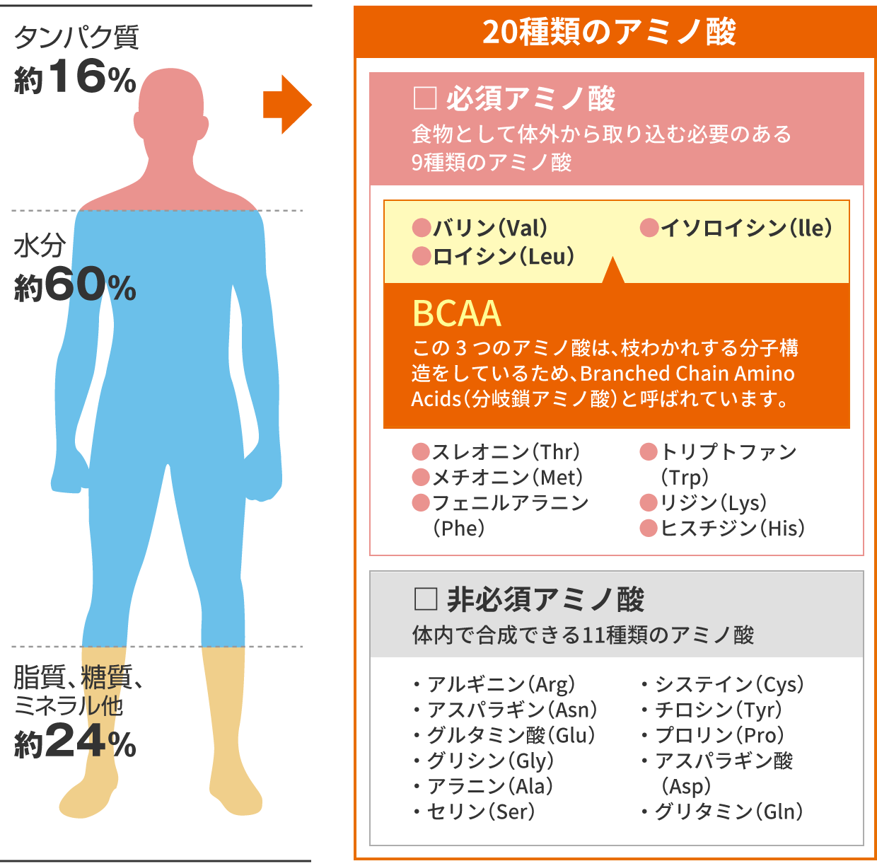 私たちのカラダの筋肉や骨はタンパク質で出来ています。そのタンパク質を構成しているのは20種類のアミノ酸。そのうち9種類は、体内では合成できない必須アミノ酸と呼ばれます。