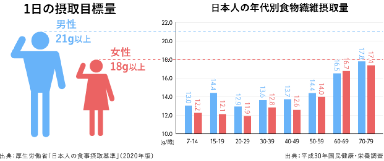 戦後から日本人の食物センイの摂取量は減り続けています。1947年の日本人1人1日あたりの食物センイ摂取量は 27.4ɡ。それが1960年には、17.42ɡと20ɡを下回り、1980年には15.7ɡと食物センイの量は年々減っています。不足の原因のひとつとして考えられるのは、戦後の生活習慣や食生活の変化。食物センイが豊富な野菜、くだもの、海藻、きのこといった食品が食卓へ登場する頻度が減り、逆に肉や魚などの食物センイがほとんど含まれない食品を食べる機会が増えたことが大きな要因でした。