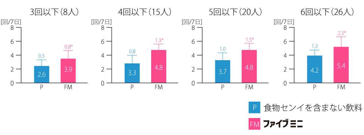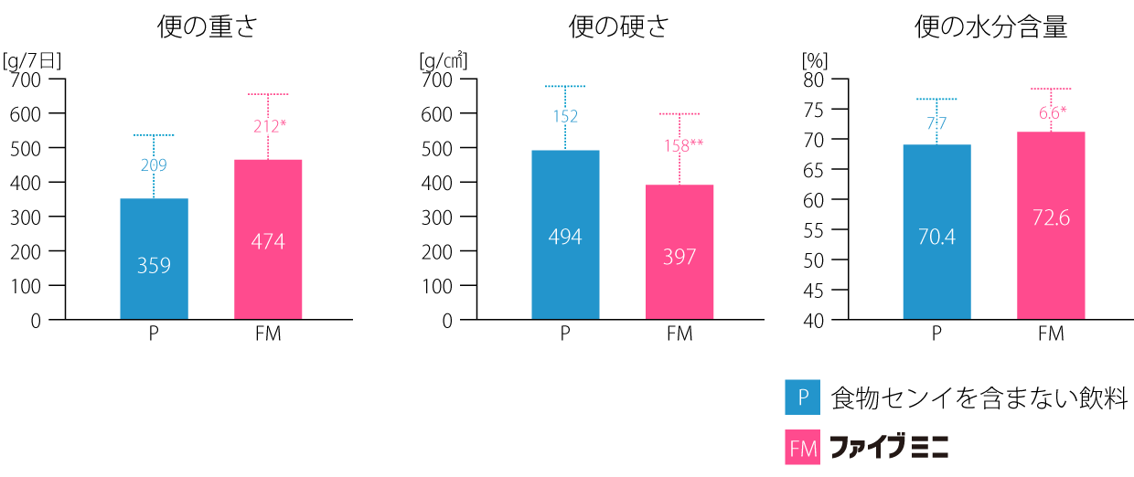 ファイブミニと食物センイを含まないプラセボ飲料をそれぞれ7日間摂取していただき、便の性状の変化について記録しました。