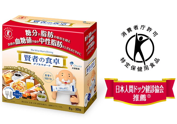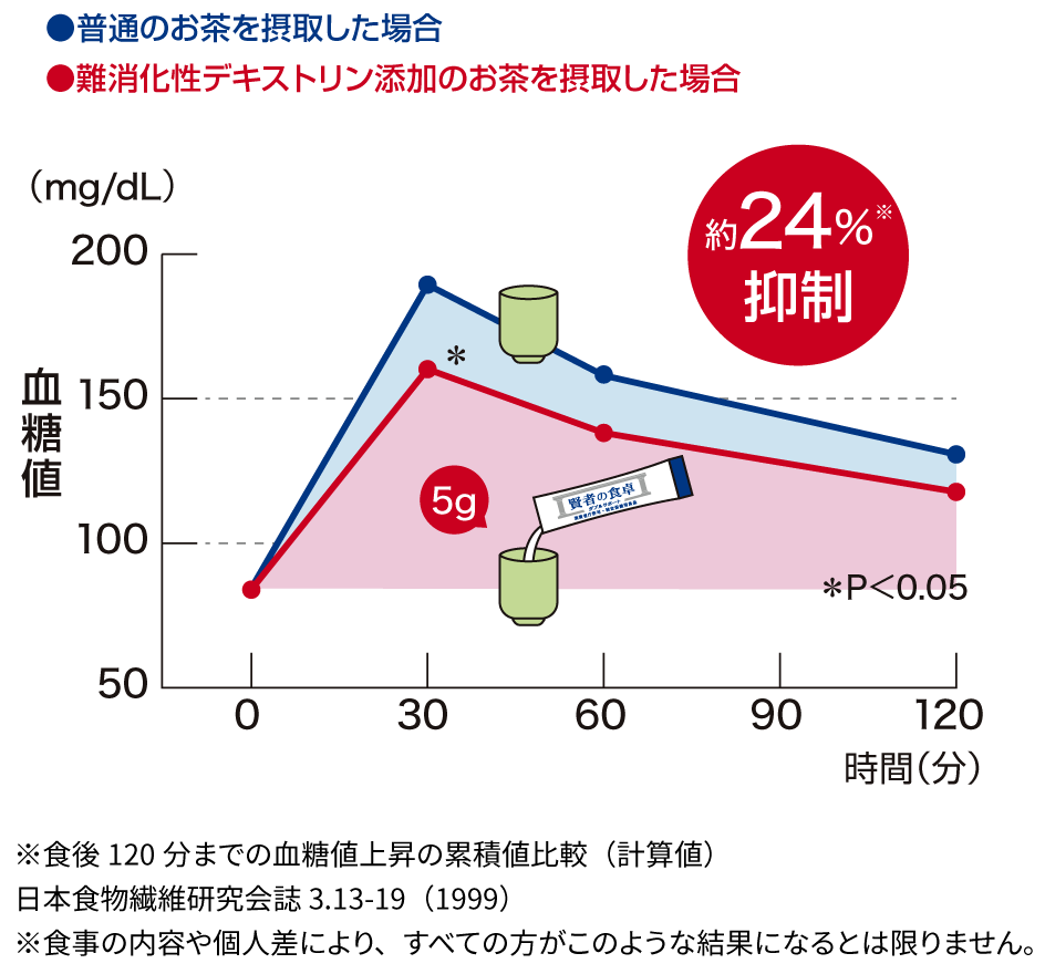 健常成人男性10名に対してうどん定食と一緒に難消化性デキストリン5ɡを配合したお茶を摂取した場合、普通のお茶と一緒に摂取したときに比べて食後の血糖値の上昇がおだやかになる事が認められました。
