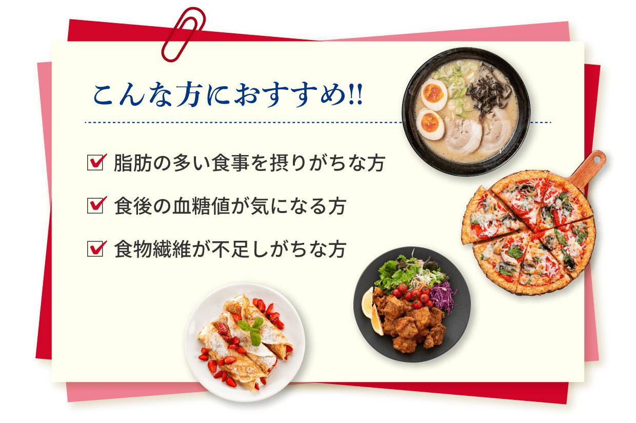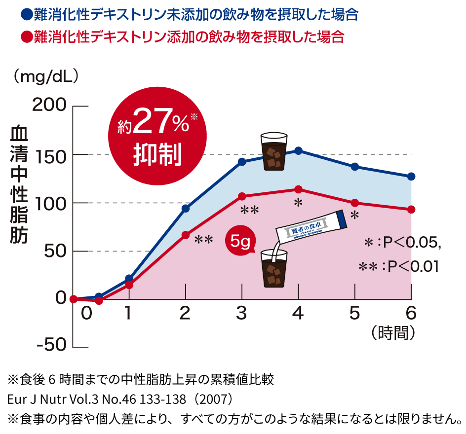 健常成人13名に対してハンバーガーとポテトと一緒に難消化性デキストリン5ɡを配合した飲料を摂取した場合、配合していない飲料を摂取した場合と比べて食後の中性脂肪値の上昇をおだやかにすることが認められました。