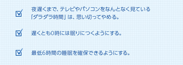 睡眠の時間を確保し、質のいい睡眠をとることが 大切です。