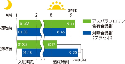 土日が休日の日勤者で、「ミュンヘンクロノタイプ質問紙(MCTQ)」でソーシャル・ジェットラグがあると判定された健康な男女44人(平均37.9歳)が対象。ソーシャル・ジェットラグ時間の平均は95.4分。アスパラプロリン55μg(酵素処理アスパラガス抽出物「ETAS®」として150mg)を含む顆粒か、偽の顆粒(対象食品)を、1日1回、夕食後から就寝までの間に摂取した場合を比較。腕に装着した活動量計のデータから入眠時刻と起床時刻を算出した。試験前1週間に含まれる休日(摂取前)と、摂取から2週目の1週間(摂取後)に含まれる休日で比較すると、摂取後の休日の起床時刻が、アスパラプロリンの摂取によって有意に早くなった。入眠時刻には差がなかった。(Jpn Pharmacol Ther.2016;44(5):743-50.)