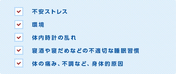 眠れない原因は人によって様々ですが、主には以下の要因が考えられています。