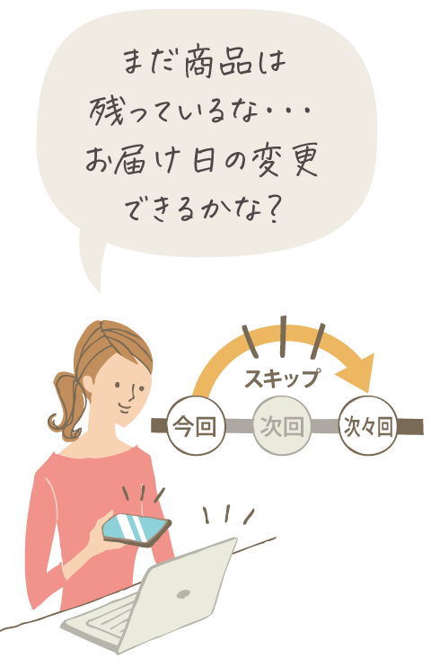 次回お届け日の変更・スキップ等のお手続きは、24時間いつでも変更いただけます。