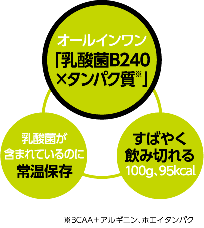 「乳酸菌、アミノ酸(BCAA+アルギニン)、ホエイタンパクの成分は別々に摂っているので、素早く効率的に摂取したい」という声がありました。