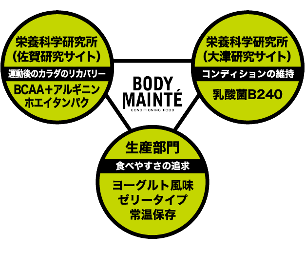 こうして誕生した新しい栄養食は、カラダ(Body)を整える(Maintenance)という意味から「ボディメンテ ゼリー」と命名されました。