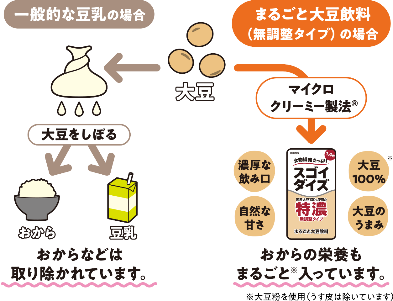 また、大豆をまるごと使用するのにも一苦労。というのも、大豆には豊富な食物繊維、不溶性のたんぱく質が含まれるため、飲料にするとのど越しが悪く、ザラザラ感が残ってしまいます。そこで検討を重ねた結果、大豆を微粉砕にし(うす皮を除く)、水に溶解した後の大塚独自の技術(マイクロクリーミー製法®)でこの問題をクリア。普通の豆乳であれば取り除かれている“おから”由来の食物繊維やたんぱく質が含まれているにもかかわらず、とても濃厚でなめらかな口当たりを実現しました。