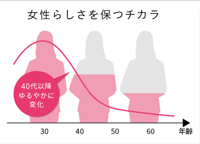 40歳を過ぎたあたりから、心身に変化を感じはじめる女性が多くなります。今までにはなかった急な感情や体調の変化に、戸惑いを覚えてしまうことも。それが女性特有の“ゆらぎ”です。この女性特有の“ゆらぎ”は、40代以降、“女性らしさを保つチカラ“がゆるやかに変化することによって引き起こります。