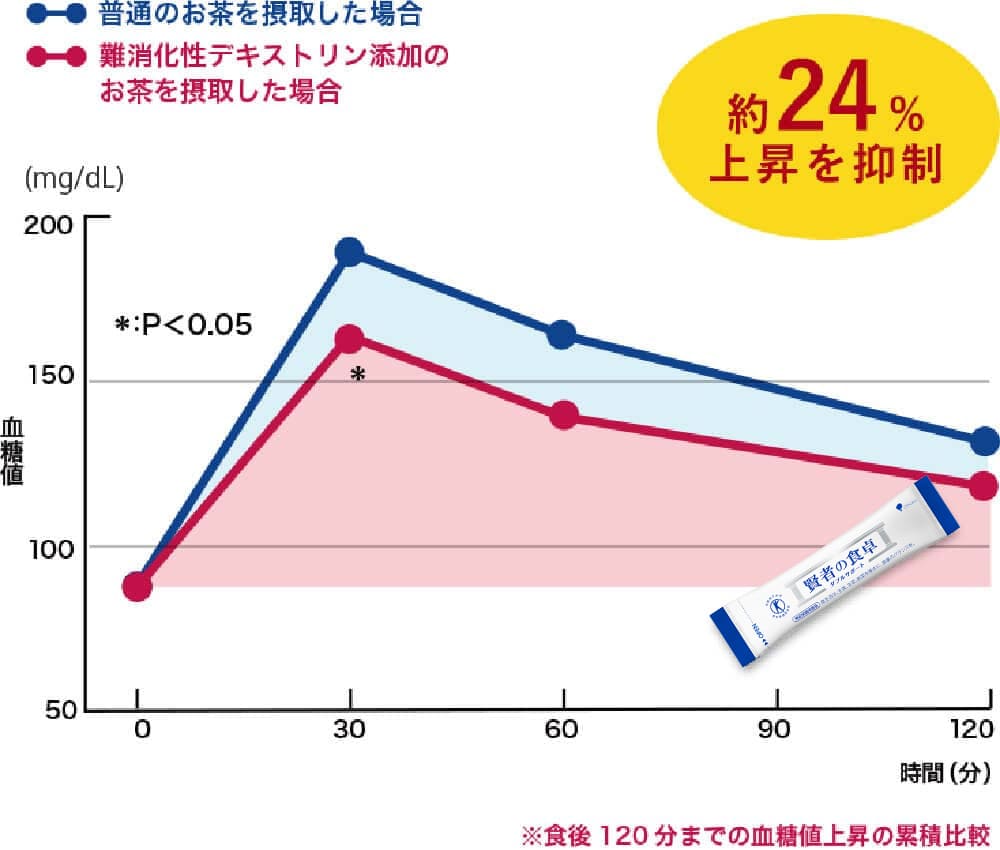 うどん定食と一緒に難消化性デキストリン5gを配合したお茶を摂取した場合、普通のお茶と一緒に摂取したときに比べて食後の血糖値の上昇がおだやかになる事が認められました。