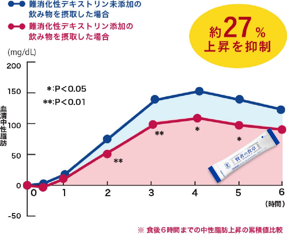 ファーストフードと一緒に難消化性デキストリン5gを配合した飲料を摂取した場合、配合していない飲料を摂取した場合と比べて食後の血中中性脂肪値の上昇をおだやかにすることが認められました。