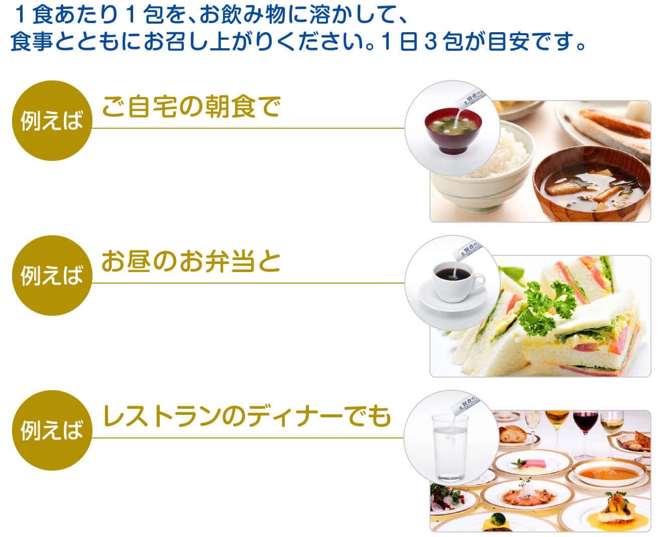 手軽に食物繊維が摂れるように工夫された「賢者の食卓 ダブルサポート」。毎日の食生活に取り入れていただくために、食事の味や食感を変えることなく続けられるよう、無味無臭で粒子の細かい粉末にしました。スティックタイプなので携帯にも便利です。