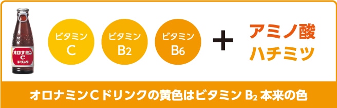 オロナミンCドリンクにはカラダに必要な5大栄養素のひとつ、ビタミン群(ビタミンC、B2、B6など)が含まれています。オロナミンCドリンクの黄色はビタミンB2本来の色です。着色料は使用しておりません。また、カラダをつくるために大切なアミノ酸やハチミツも入っています。おいしさの秘密は、茶色のビンにもあり、実は光に触れると壊れやすいビタミンを守るため、このビンを使っているのです。