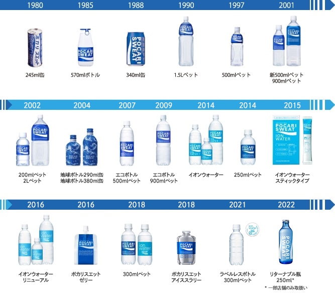 「水と電解質の補給と吸収スピード」という商品の本質を表現して誕生した、鮮やかなブルーと白い波形のパッケージデザイン。そのデザインは40年以上経った今もほとんど変更されることなく、店頭に並び、人々に親しまれています。しかし、今では普通に使われるブルーも、発売当時、飲料業界ではタブー色だったため、「オイル缶みたい」と言われることも。それでも「デザインは本質を表現するもの」というデザイナーの信念と「商品コンセプトを伝える」という社長の強い意志によって、このデザインは採用されたのです。