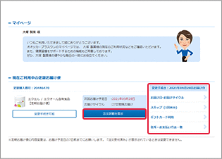 ログイン後、マイページへアクセスすると、現在ご利用中の定期お届け便一覧が表示されます。
