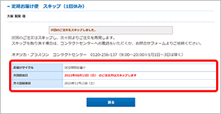 誤ってスキップしてしまった場合は、オオツカ・プラスワン コンタクトセンターにご連絡いただくか、[お問い合わせフォーム]の「納期・お届けについて」をご選択いただき、必要事項を記入の上、ご連絡ください。