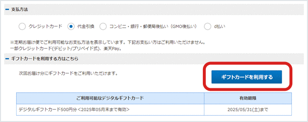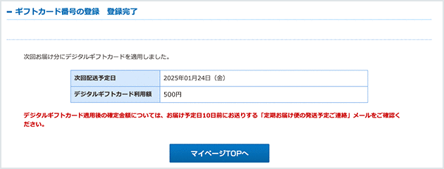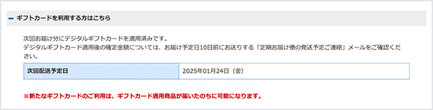 ギフトカード適用後の確定金額については、お届け予定日10日前にお送りする「定期お届け便の発送予定ご連絡」メールをご確認ください。