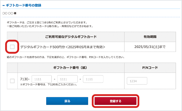 利用するデジタルギフトカードにチェックを入れて「登録する」ボタンをクリックしてください。