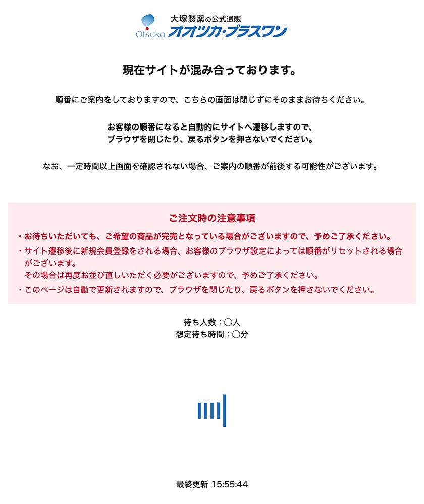 お客様の順番になると自動的にサイトへ遷移します。 - ※待ち時間は目安となります。お待ちの人数により自動で更新されますので、ブラウザを閉じたり、戻るボタンを押さないでください。